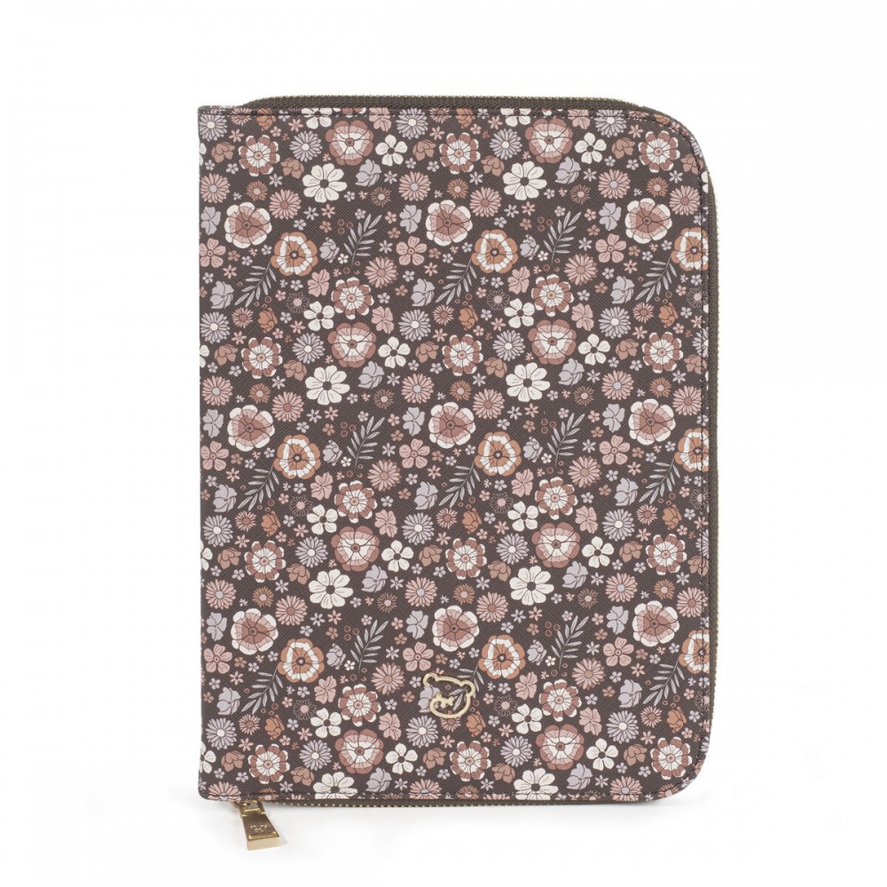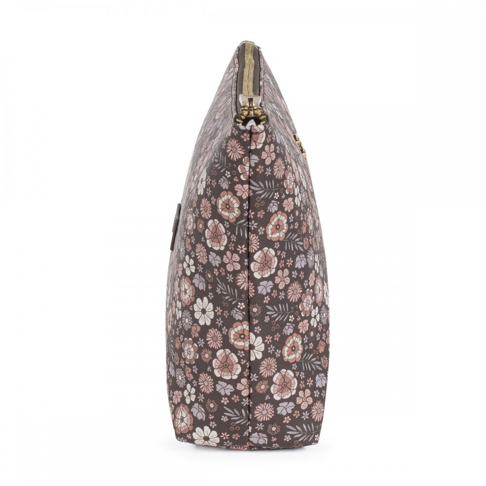 Está elaborado en resistente y suave polipiel estampada con flores y con una forma para acomodar fácilmente en el bolso canastilla a un lado.