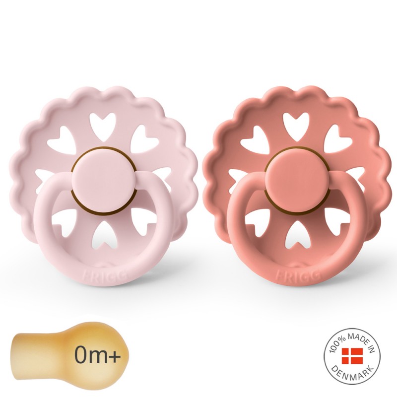 FRIGG Fairytale con bordes festoneados y corazones que rodean el escudo imitan un recorte de papel específico de H. C. Andersen. Los 8 corazoncitos sustentan la universalidad de su obra creativa, y simbolizan el amor, el lenguaje universal del mundo. Esta es la inspiración que se encuentra dentro de los chupetes FRIGG Fairytale: son accesibles para todos porque el amor es un lenguaje universal