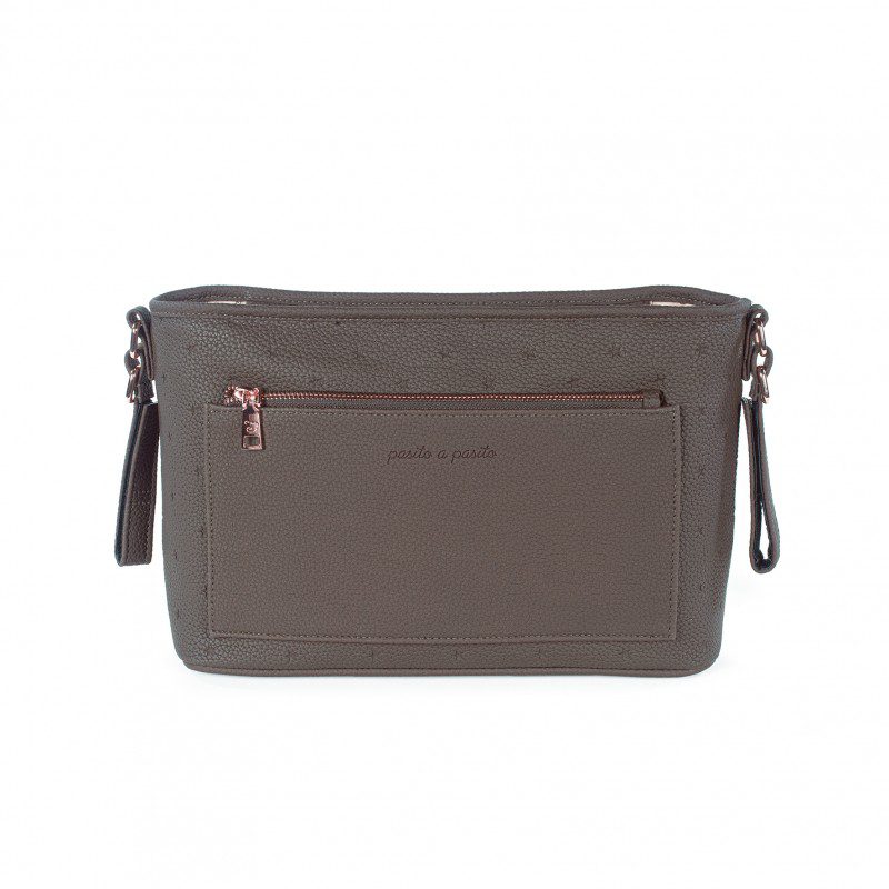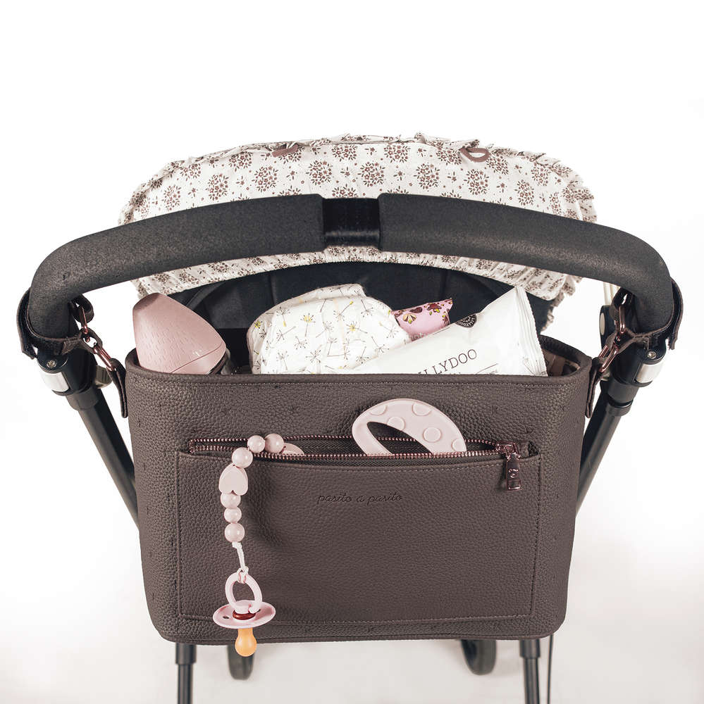 Bolso organizador London en polipiel coffee con estrellas grabadas para silla de paseo de gran capacidad para llevar todo lo necesario para el paseo del bebe. Tiene bolsillos exteriores e interiores para poder tener todo ordenado y a mano. Tiene un bolsillo interior plastificado para la ropa mojada. Asas cortas para su colocación en cualquier modelo de silla de paseo.