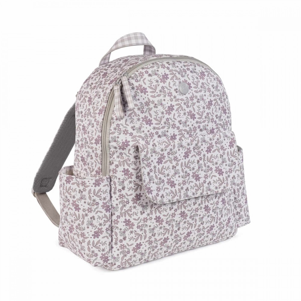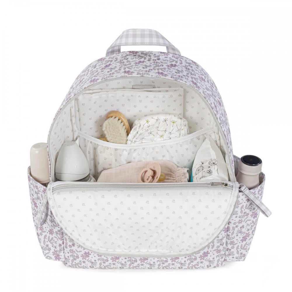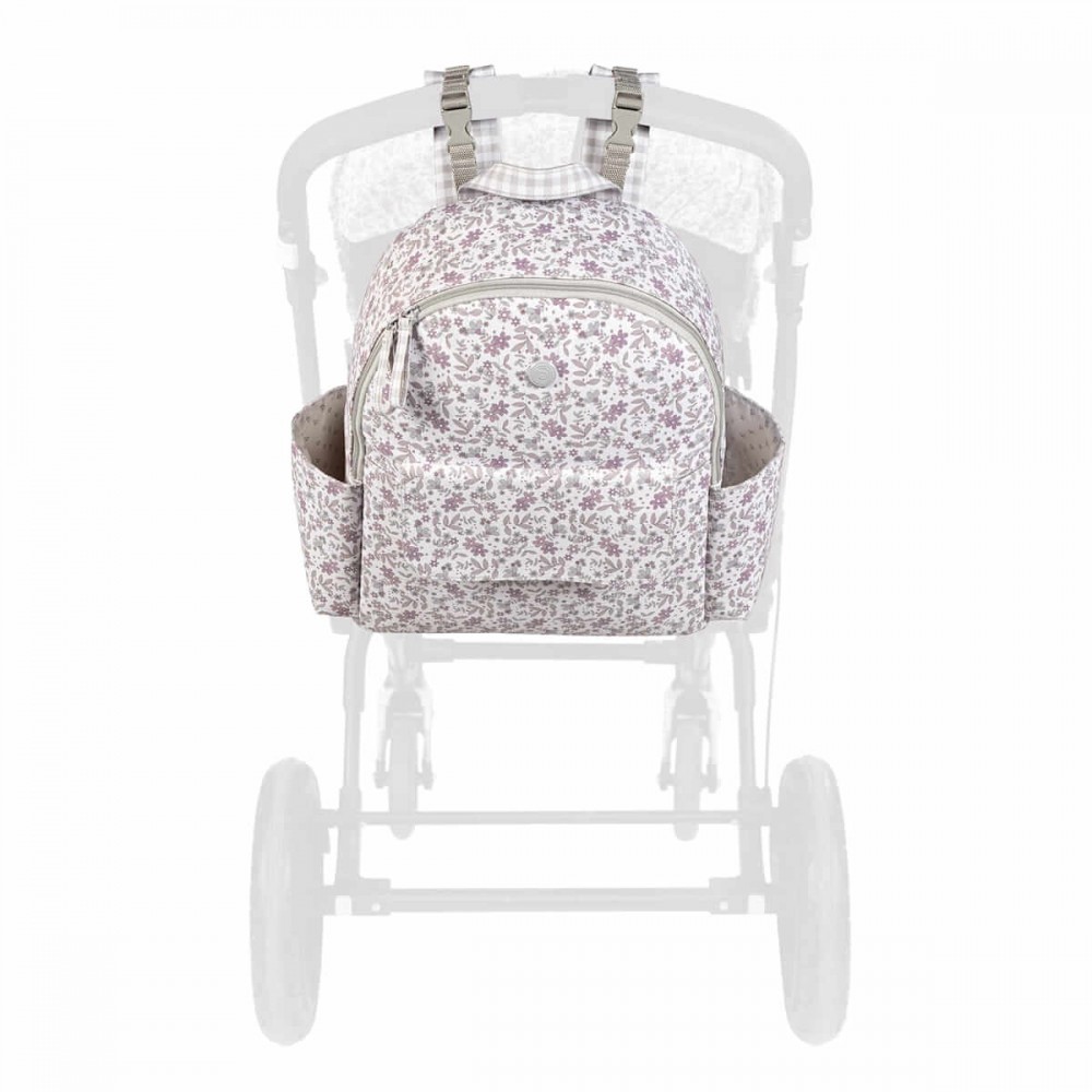 Mochila en polipiel impresa con flores Delia con una gran capacidad para llevar todo lo que necesitas tú y tu bebé.