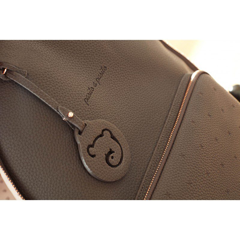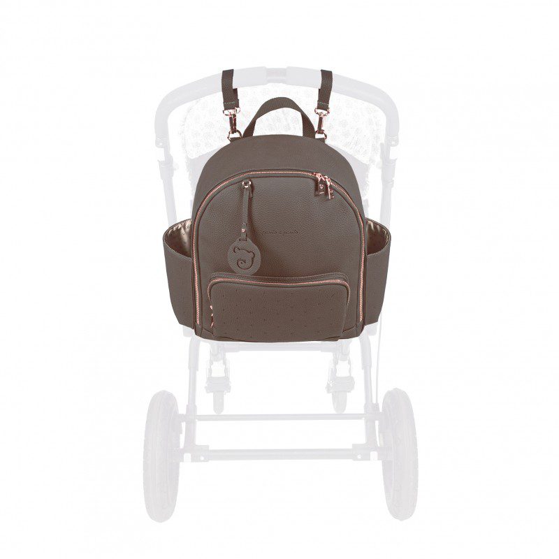 Mochila en polipiel coffee con estrellas grabadas London. De gran capacidad para llevar todo lo que necesitas tu y tu bebé. Bolsillos interiores y exteriores para tenerlo todo a mano y en orden. Compartimento para portátil o tablet. Tiene 2 asas grandes ajustables para que puedas usarla colgada a la espalda y otras dos asas pequeñas para que puedas usarla colgada del carrito del bebé. Incorpora una cinta para transportarla con tu equipaje.