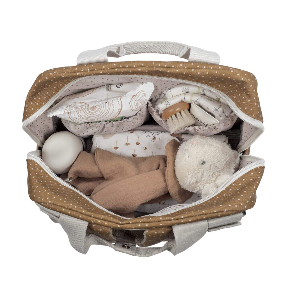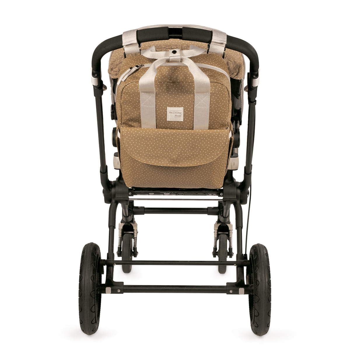 Una bolsa canastilla y mochila al mismo tiempo, muy moderna y urbana, ideal para llevar tus cosas y las de tu bebé, con mucho estilo, a todos sus paseos. La bolsa Poppy Canela de topitos para silla de paseo es un modelo multifunción muy ligero, resistente y de gran capacidad para llevar todo lo necesario en el paseo del bebe. Su esquema ofrece múltiples bolsillos exteriores e interiores para poder tener todo ordenado y a mano. Tiene bolsillos para guardar los biberones y mantenerlos seguros, elásticos para colocar cubiertos, para las toallitas húmedas, también tiene un funda para la botella de agua y otros más. Incluye un cambiador a juego con el bolso de maternidad y un bolsillo plastificado para almacenar la ropa mojada y aislar la humedad del resto de la mochila. El bolso incluye 2 asas cortas ajustables que facilitan la colocación en cualquier modelo de silla de paseo, asas de mano y correas acolchadas para colgar en los hombros hacia la espalda, sin generar molestias por el peso. Gran calidad y mucho estilo. Fabricada en un material resistente y de fácil limpieza. Walking Mum protege a tu bebé utilizando los mejores tejidos, libres de colorantes azoicos y sustancias nocivas para la salud. Nuestra colección Walking Mum guarda toda la calidad de la marca Pasito a Pasito pero con un particular sello de estilo urbano y moderno que no pasa desapercibido, para vestir diferente los paseos con tu bebé. Las bolsas de maternidad de esta línea son más sport y prácticas, especialmente pensadas en mamás y papás modernos que aprecian los diseños más actuales y en tendencia sin dejar de lado la calidad y la funcionalidad de los accesorios que complementan y hacen más cómodos todos los paseos con sus bebés.