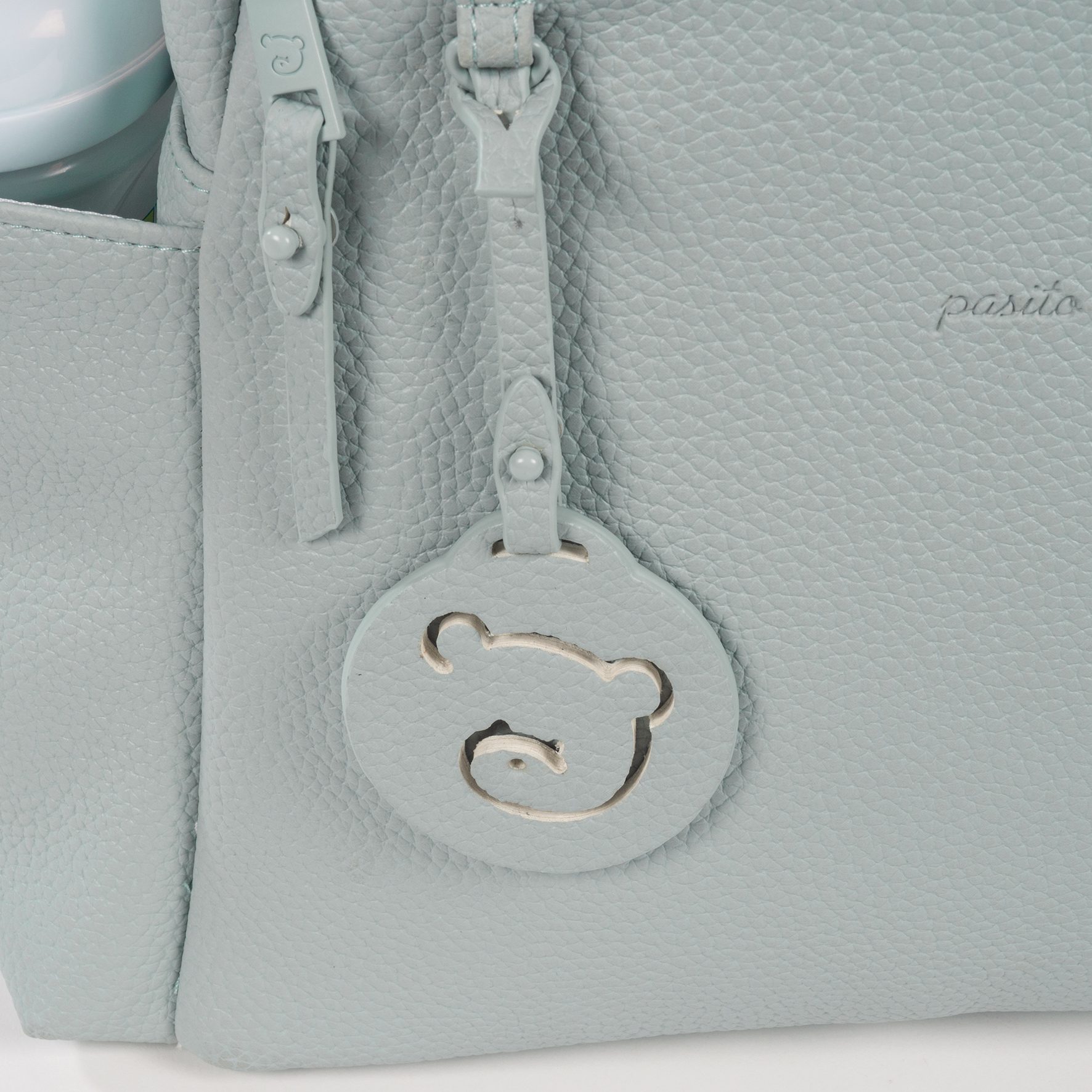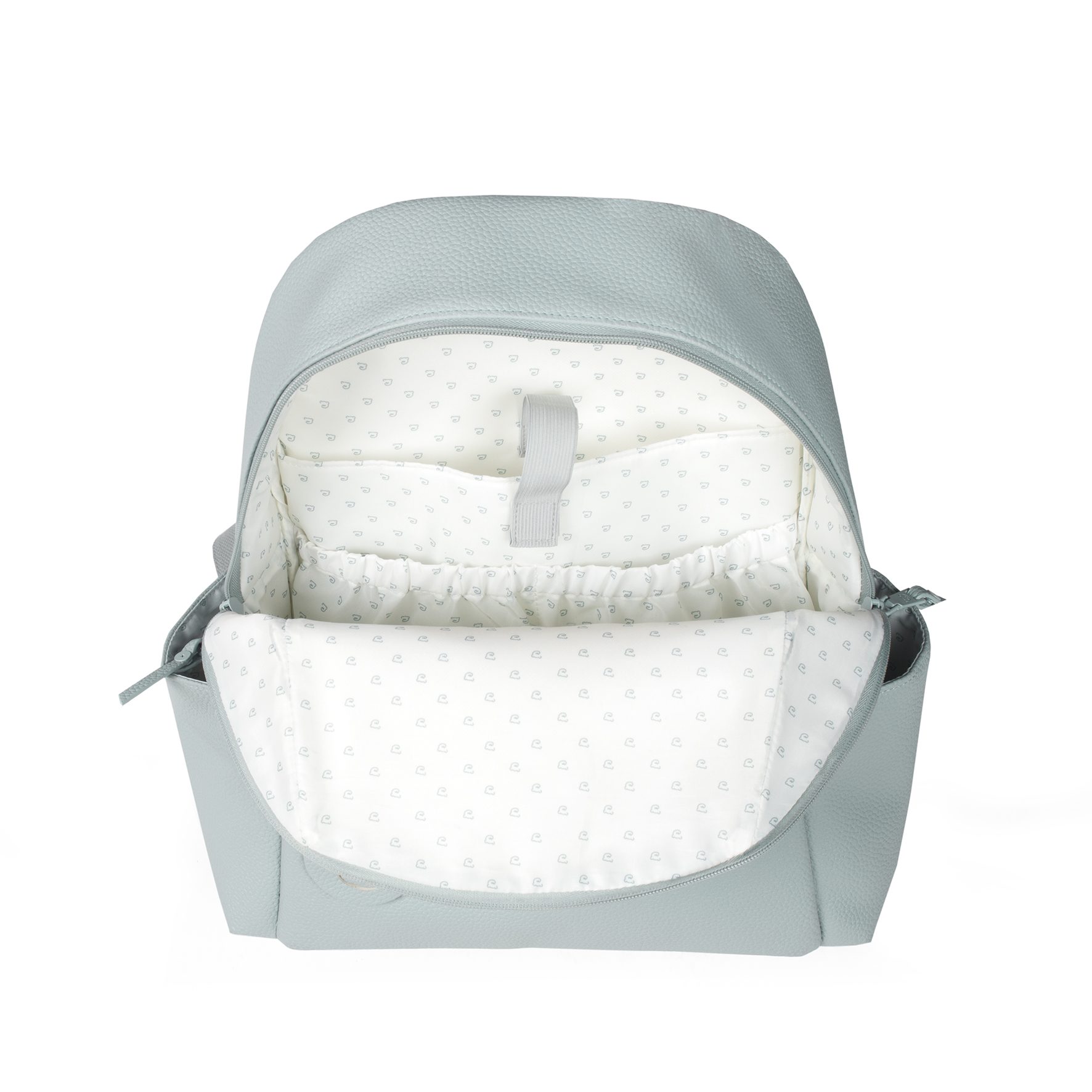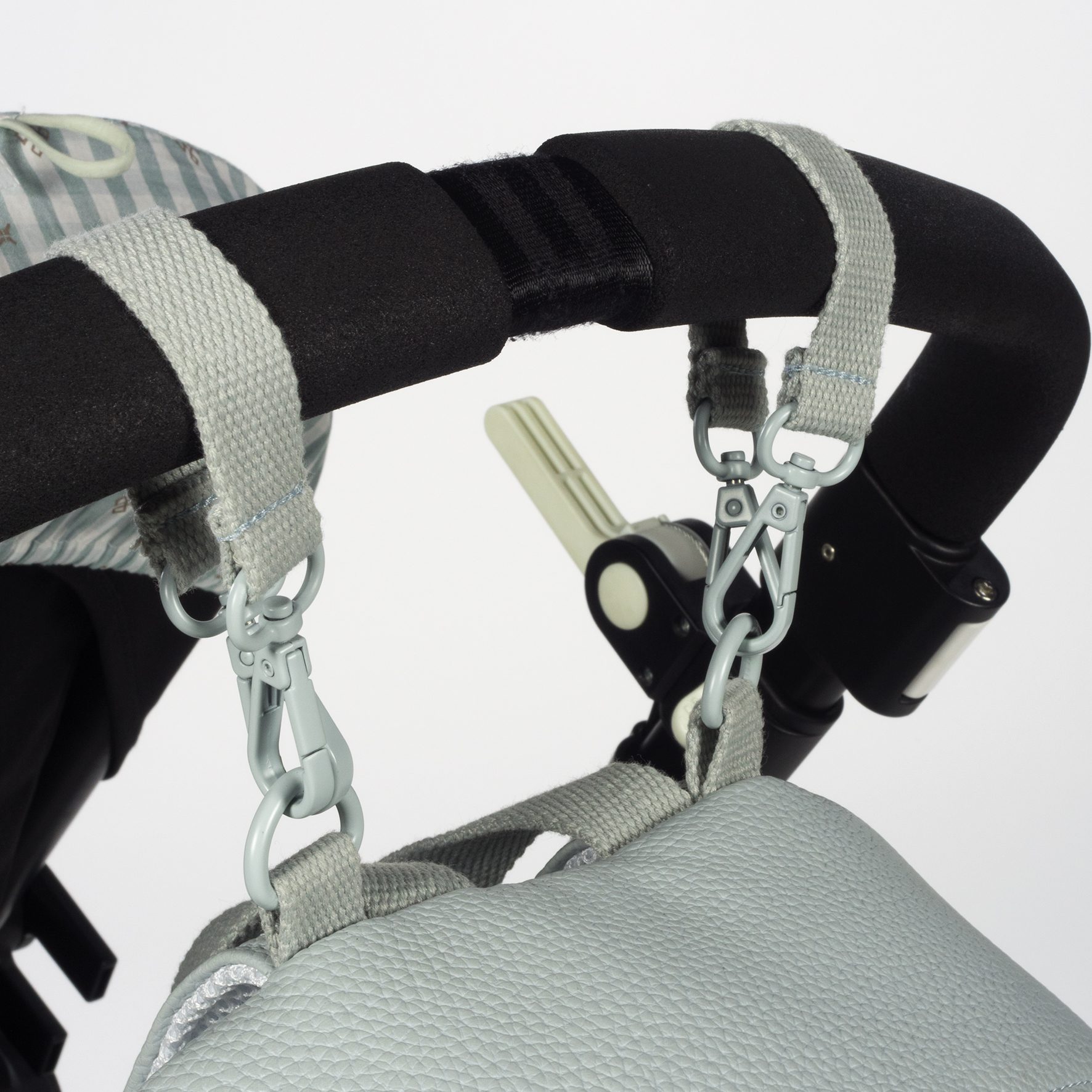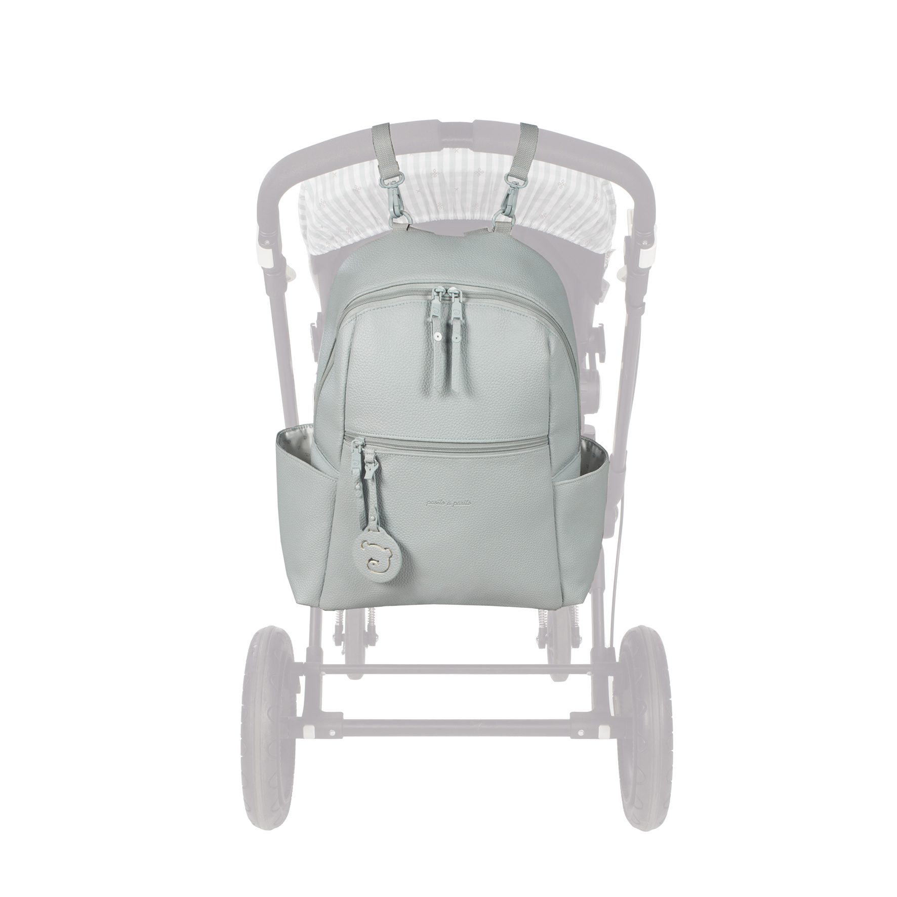 La mochila para carrito de bebé o silla de paseo Yummi es un modelo único, elaborado en resistente y delicada polipiel con tonalidad clara en color verde mint, para llevar todo lo que necesita tu bebé al salir de casa.
