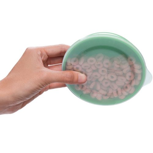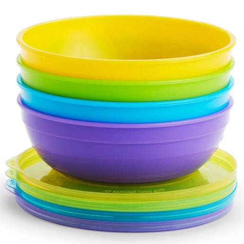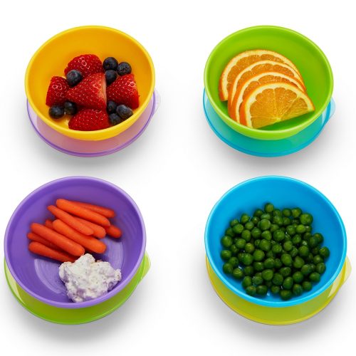 El set Incluye 4 cuencos, 4 tapas y 2 cucharas de punta blanda y fácil agarre
