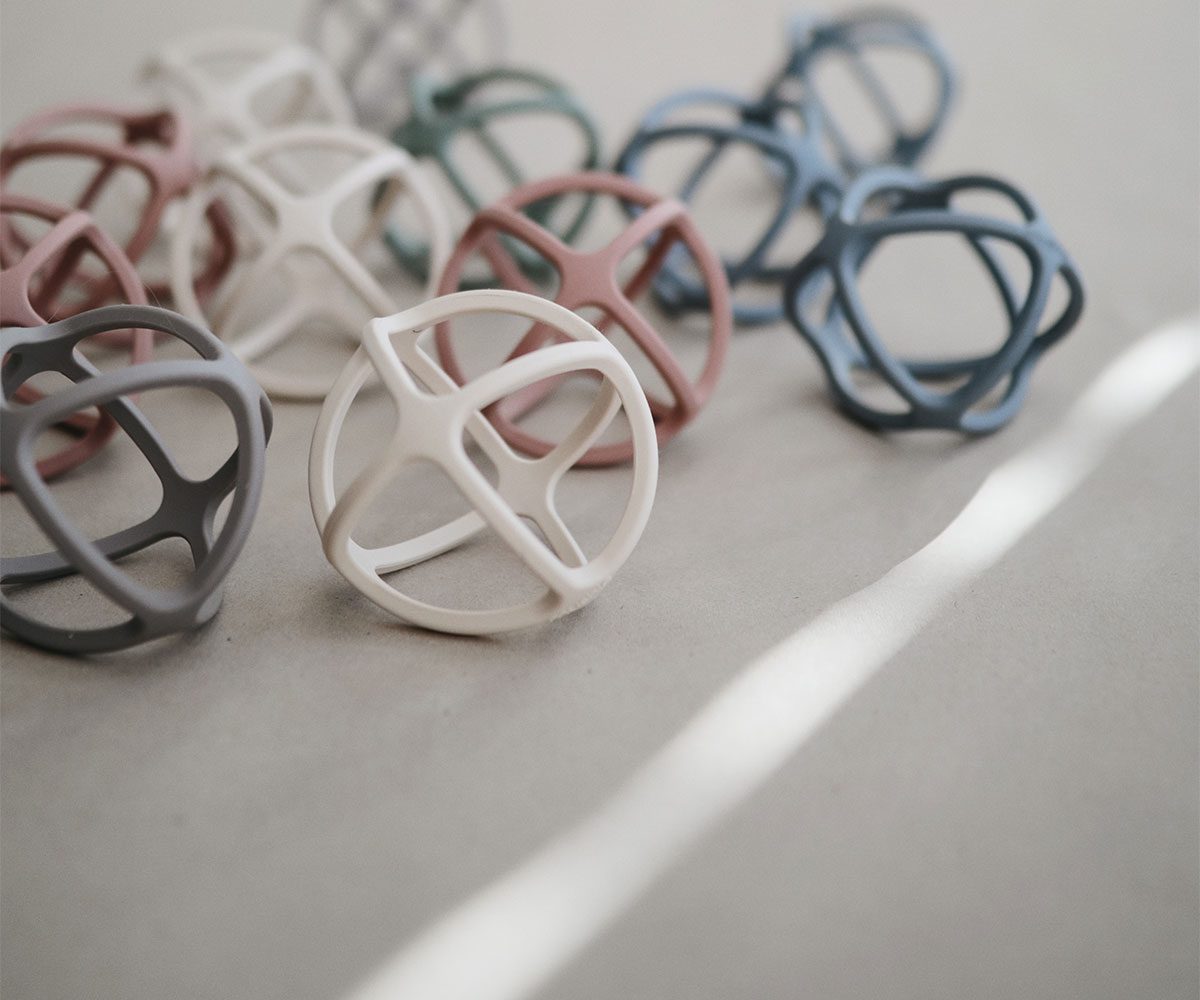 Mordedor en forma de bola geométrica y que está hecho de silicona de grado alimenticio 100% no tóxica.