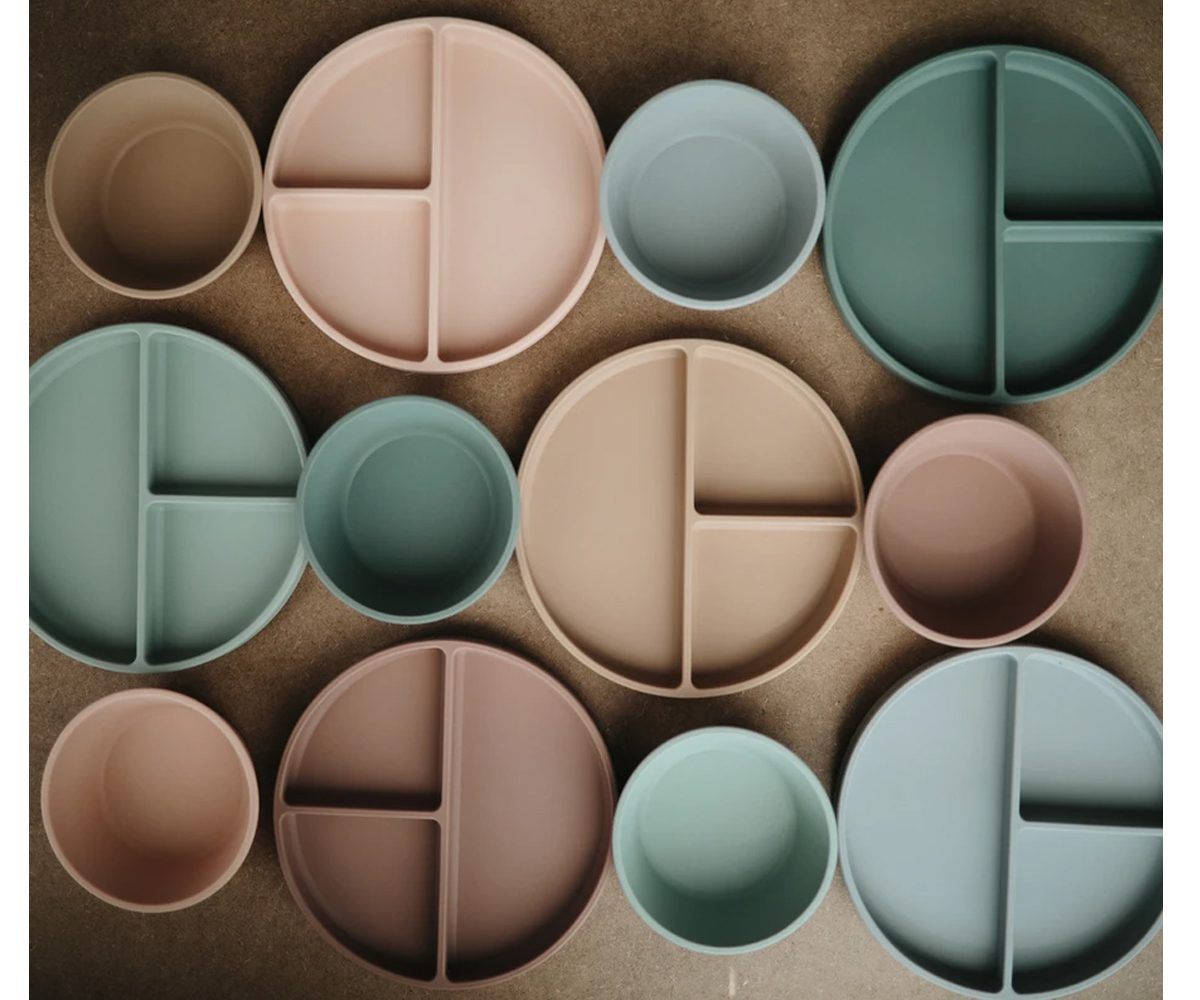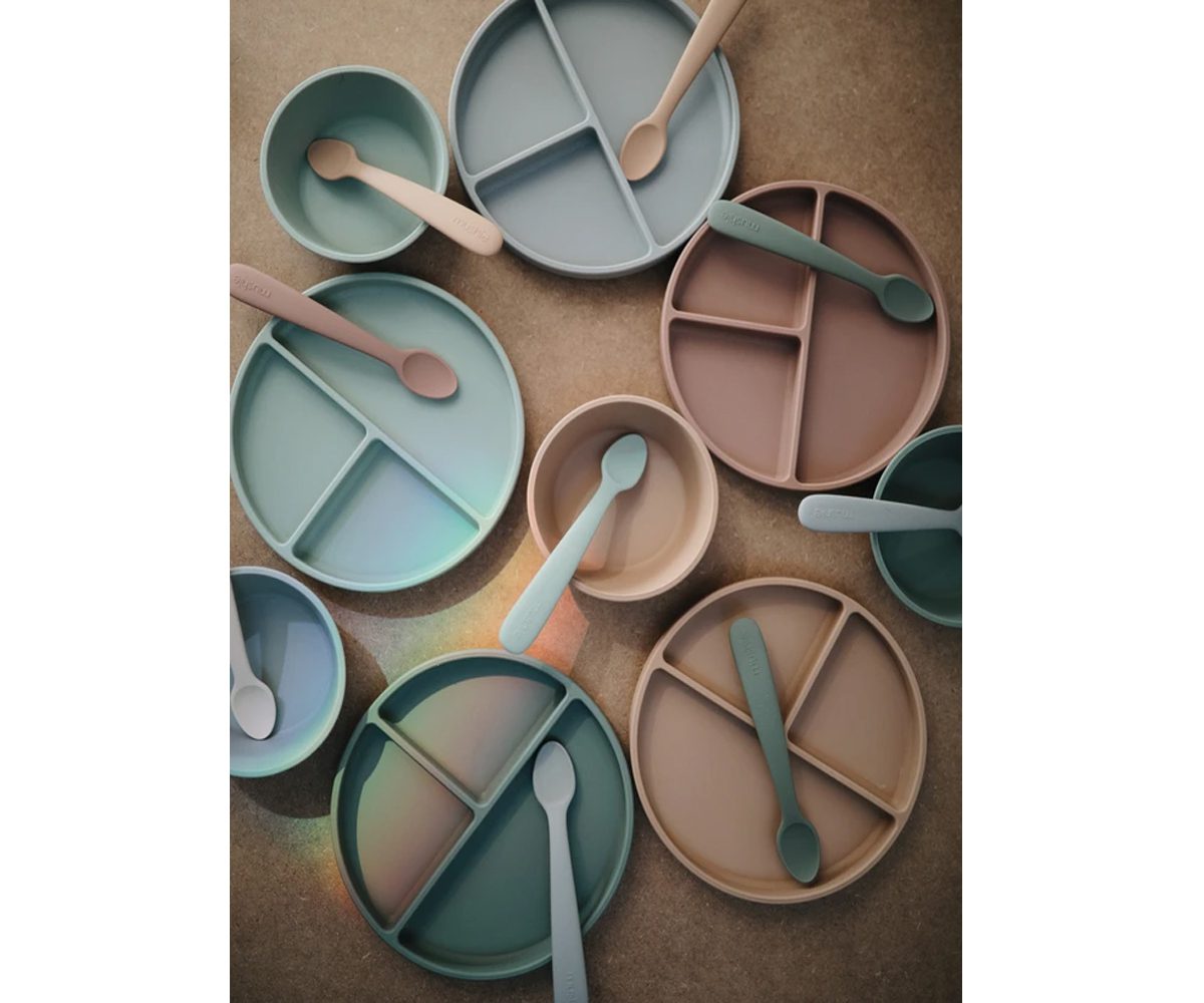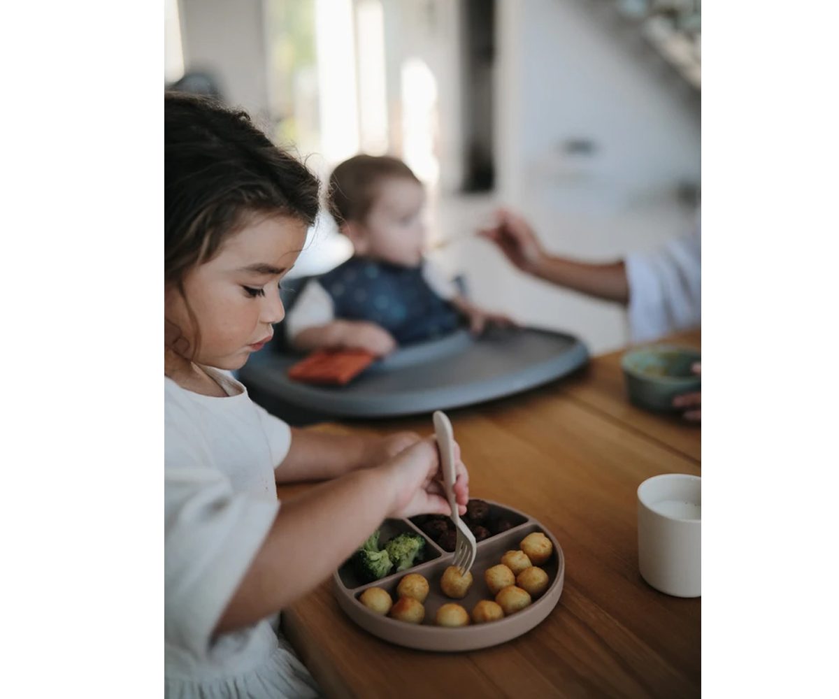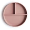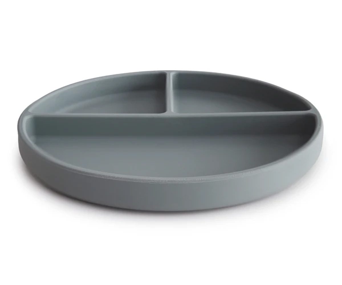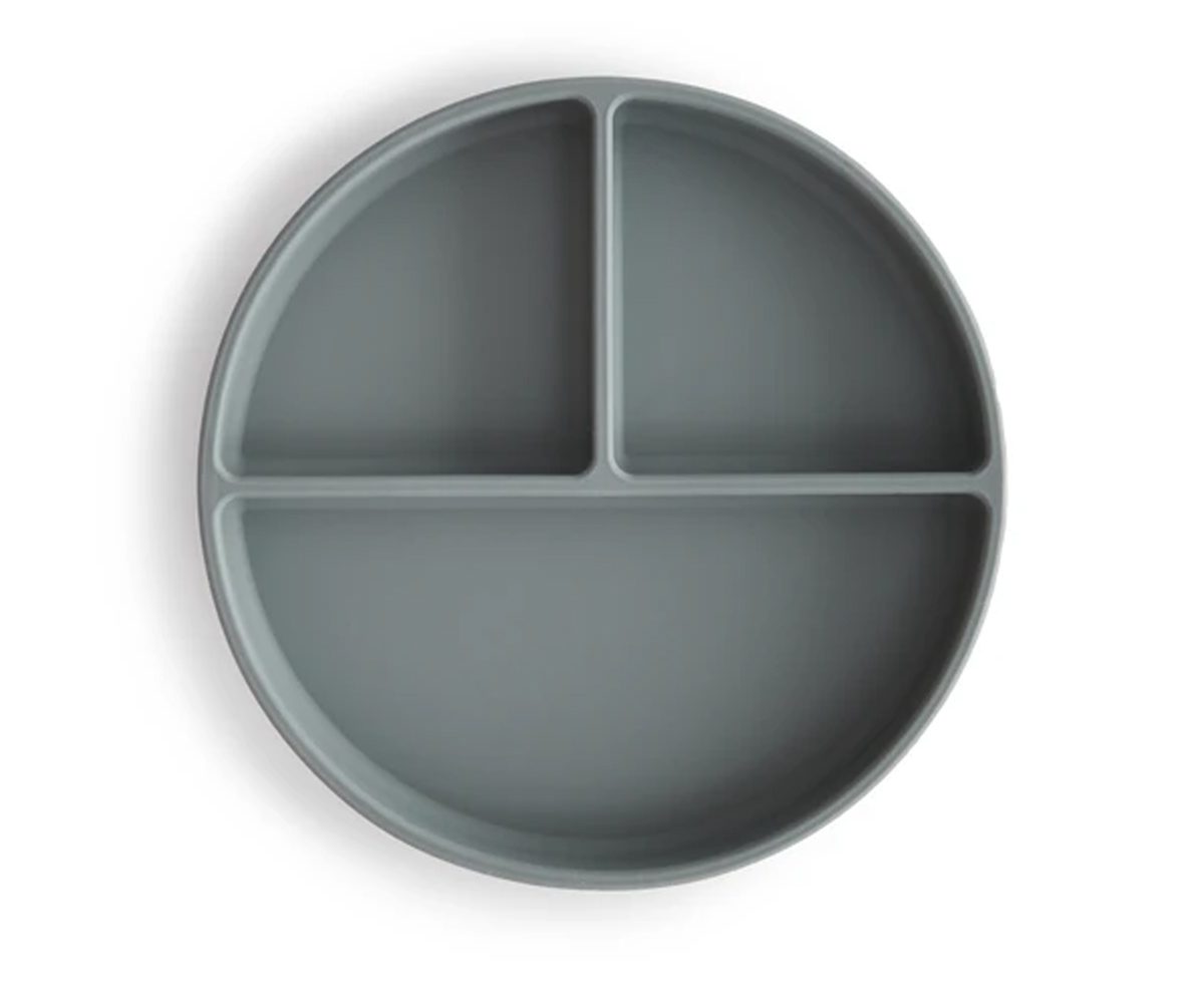 Este plato de silicona con colores suaves y diseño simple y elegante de Mushie , cuenta con compartimentos y con una ventosa que lo mantiene en su lugar mientras tu peque aprende a comer solo.