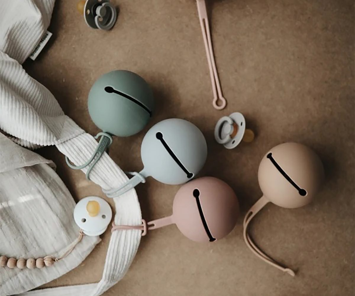 Precioso guardachupetes fabricado en silicona de la marca Mushie para colocar hasta 3 chupetes y llevar colgado en el bolso de maternidad o incluso en el carrito del bebé y tenerlo al alcance de la mano.