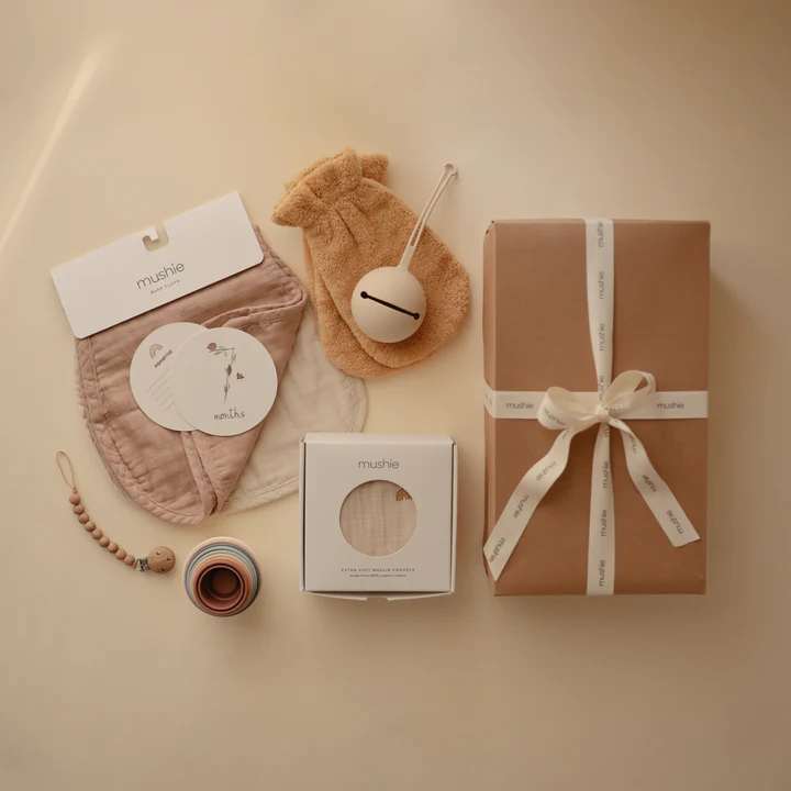 Regale artículos básicos para recién nacidos a familiares y amigos en fiestas de nacimiento, visitas al hospital o la primera llegada del bebé a casa. Con tres regalos clásicos de Mushie, las nuevas mamás apreciarán nuestro envoltorio de muselina de algodón orgánico, los chupetes FRIGG Daisy Night de caucho natural y nuestro clip de silicona para chupetes Hera.