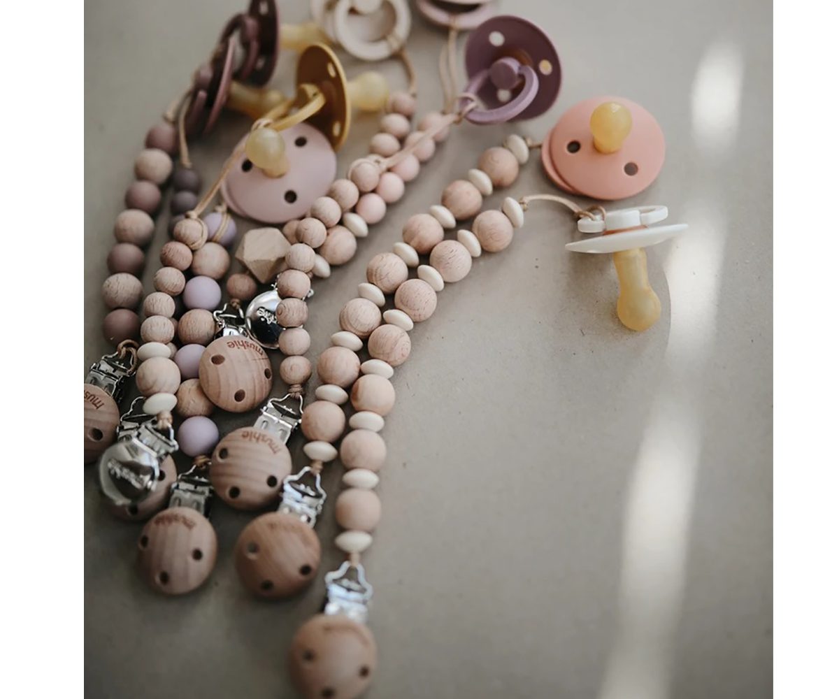 Los sujetachupetes de MUSHIE, en colores únicos y elegantes. están hechos con cuentas de silicona y son de inspiración vintage.