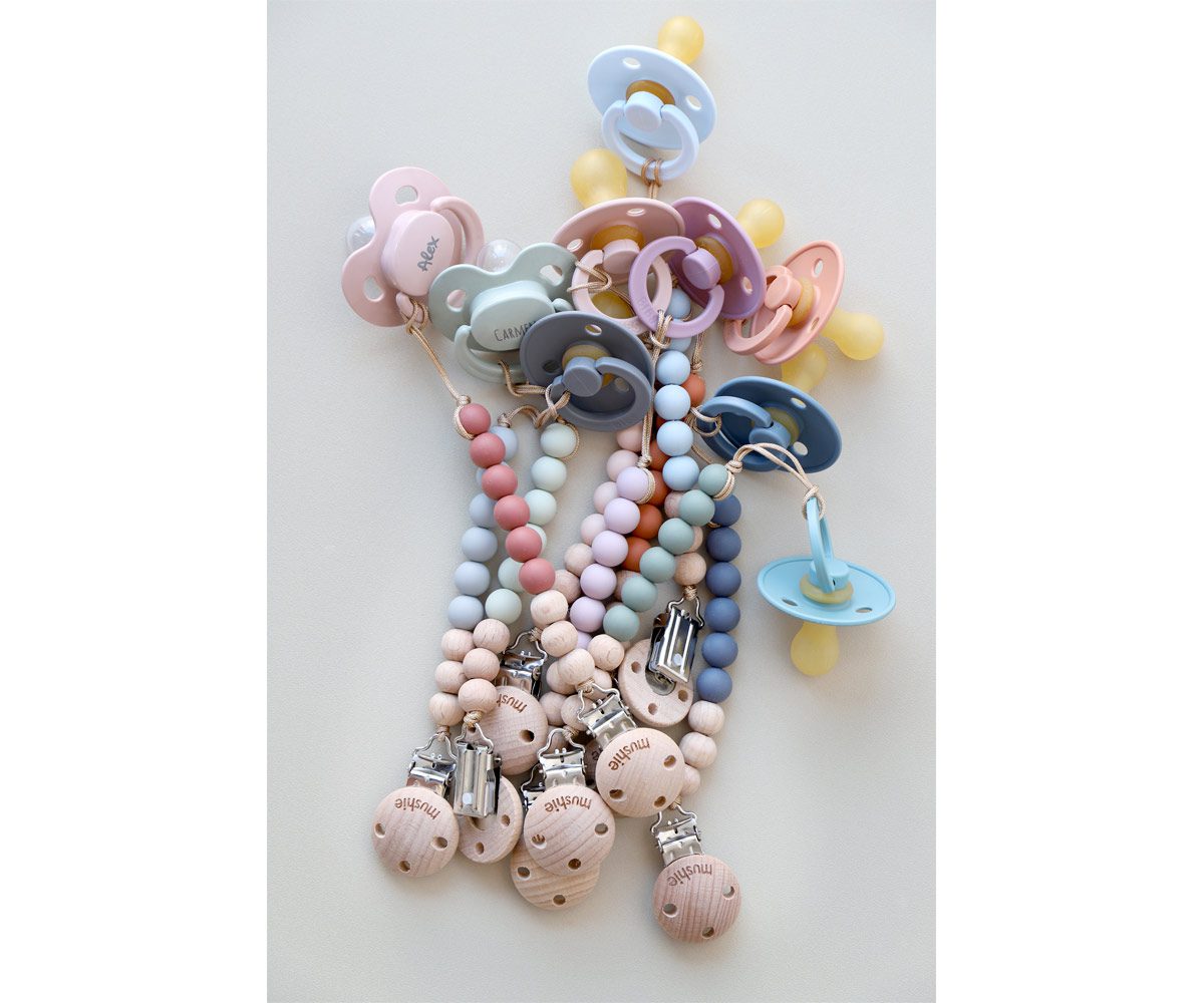 Los sujetachupetes de MUSHIE, en colores únicos y elegantes. están hechos con cuentas de silicona y son de inspiración vintage.