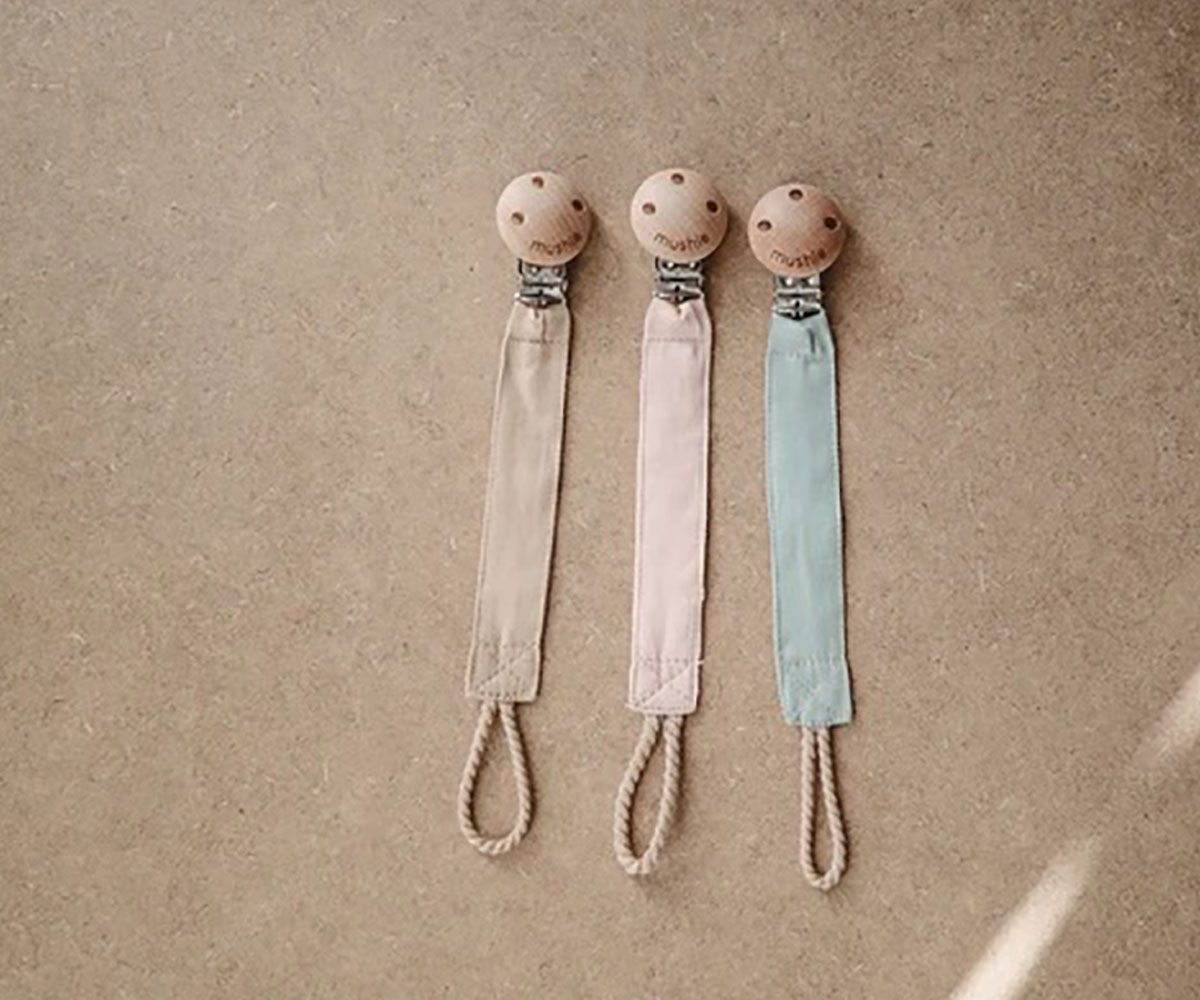 Este sujetachupete de Mushie hecho con tela, es simple y atemporal